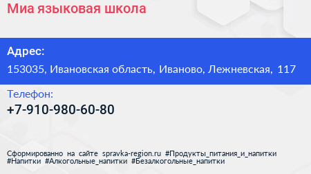 Миа, языковая школа по адресу 153035, Ивановская область, Иваново, Лежневская, 117 в дальнейшем Организация, размещена в следующих категориях: