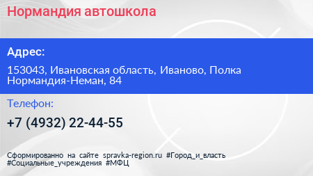 Нормандия, автошкола по адресу 153043, Ивановская область, Иваново, Полка Нормандия-Неман, 84 в дальнейшем Организация, размещена в следующих категориях: