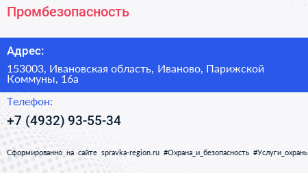 Промбезопасность по адресу 153003, Ивановская область, Иваново, Парижской Коммуны, 16а в дальнейшем Организация, размещена в следующих категориях: