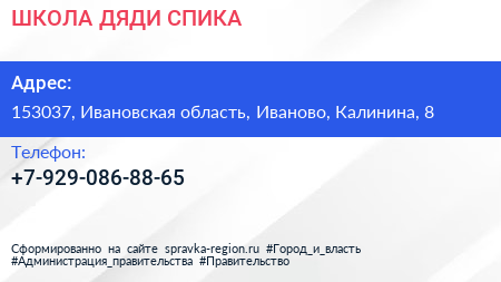 ШКОЛА ДЯДИ СПИКА по адресу 153037, Ивановская область, Иваново, Калинина, 8 в дальнейшем Организация, размещена в следующих категориях:
