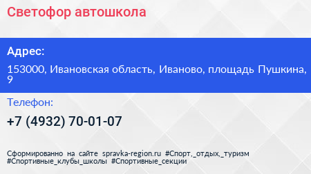 Светофор, автошкола по адресу 153000, Ивановская область, Иваново, площадь Пушкина, 9 в дальнейшем Организация, размещена в следующих категориях: