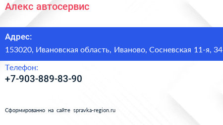Алекс, автосервис по адресу 153020, Ивановская область, Иваново, Сосневская 11-я, 34 в дальнейшем Организация, размещена в следующих категориях: