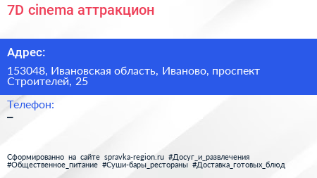 7D cinema, аттракцион по адресу 153048, Ивановская область, Иваново, проспект Строителей, 25 в дальнейшем Организация, размещена в следующих категориях:
