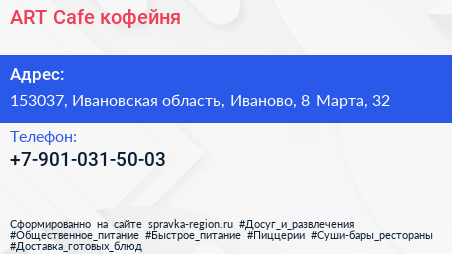 ART Cafe, кофейня по адресу 153037, Ивановская область, Иваново, 8 Марта, 32 в дальнейшем Организация, размещена в следующих категориях:
