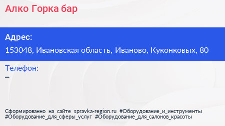 Алко-Горка, бар по адресу 153048, Ивановская область, Иваново, Куконковых, 80 в дальнейшем Организация, размещена в следующих категориях: