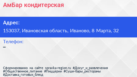 АмБар, кондитерская по адресу 153037, Ивановская область, Иваново, 8 Марта, 32 в дальнейшем Организация, размещена в следующих категориях:
