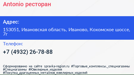 Antonio, ресторан по адресу 153051, Ивановская область, Иваново, Кохомское шоссе, 7г в дальнейшем Организация, размещена в следующих категориях: