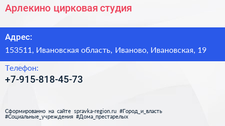 Арлекино, цирковая студия по адресу 153511, Ивановская область, Иваново, Ивановская, 19 в дальнейшем Организация, размещена в следующих категориях: