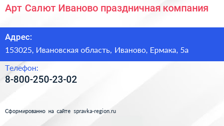 Арт-Салют Иваново, праздничная компания по адресу 153025, Ивановская область, Иваново, Ермака, 5а в дальнейшем Организация, размещена в следующих категориях: