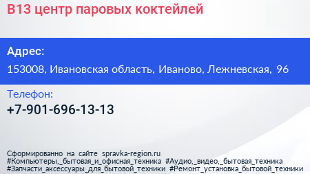 B13, центр паровых коктейлей по адресу 153008, Ивановская область, Иваново, Лежневская, 96 в дальнейшем Организация, размещена в следующих категориях: