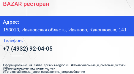 BAZAR, ресторан по адресу 153013, Ивановская область, Иваново, Куконковых, 141 в дальнейшем Организация, размещена в следующих категориях: