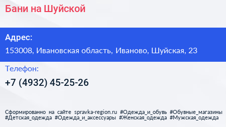 Бани на Шуйской по адресу 153008, Ивановская область, Иваново, Шуйская, 23 в дальнейшем Организация, размещена в следующих категориях: