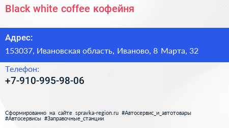 Black & white coffee, кофейня по адресу 153037, Ивановская область, Иваново, 8 Марта, 32 в дальнейшем Организация, размещена в следующих категориях: