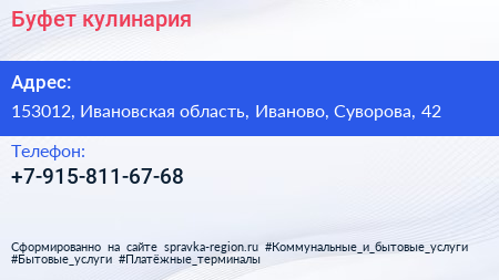 Буфет, кулинария по адресу 153012, Ивановская область, Иваново, Суворова, 42 в дальнейшем Организация, размещена в следующих категориях: