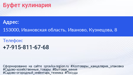 Буфет, кулинария по адресу 153000, Ивановская область, Иваново, Кузнецова, 8 в дальнейшем Организация, размещена в следующих категориях: