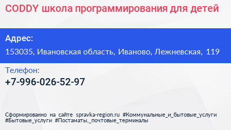 CODDY, школа программирования для детей по адресу 153035, Ивановская область, Иваново, Лежневская, 119 в дальнейшем Организация, размещена в следующих категориях: