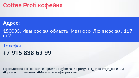 Coffee Profi, кофейня по адресу 153035, Ивановская область, Иваново, Лежневская, 117 ст2 в дальнейшем Организация, размещена в следующих категориях: