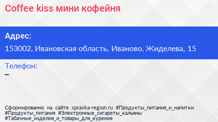 Coffee kiss, мини-кофейня по адресу 153002, Ивановская область, Иваново, Жиделева, 15 в дальнейшем Организация, размещена в следующих категориях: