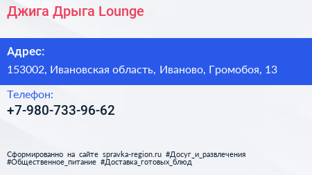 Джига-Дрыга Lounge по адресу 153002, Ивановская область, Иваново, Громобоя, 13 в дальнейшем Организация, размещена в следующих категориях: