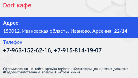 Dorf, кафе по адресу 153012, Ивановская область, Иваново, Арсения, 22/14 в дальнейшем Организация, размещена в следующих категориях: