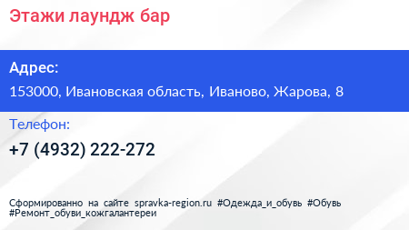 Этажи, лаундж-бар по адресу 153000, Ивановская область, Иваново, Жарова, 8 в дальнейшем Организация, размещена в следующих категориях:
