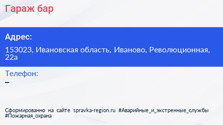 Гараж, бар по адресу 153023, Ивановская область, Иваново, Революционная, 22а в дальнейшем Организация, размещена в следующих категориях: