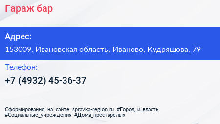 Гараж, бар по адресу 153009, Ивановская область, Иваново, Кудряшова, 79 в дальнейшем Организация, размещена в следующих категориях: