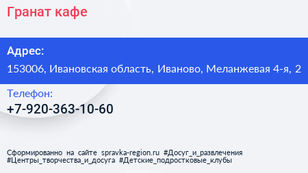 Гранат, кафе по адресу 153006, Ивановская область, Иваново, Меланжевая 4-я, 2 в дальнейшем Организация, размещена в следующих категориях: