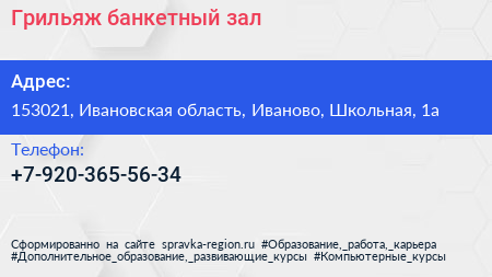 Грильяж, банкетный зал по адресу 153021, Ивановская область, Иваново, Школьная, 1а в дальнейшем Организация, размещена в следующих категориях: