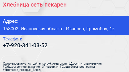 Хлебница, сеть пекарен по адресу 153002, Ивановская область, Иваново, Громобоя, 15 в дальнейшем Организация, размещена в следующих категориях: