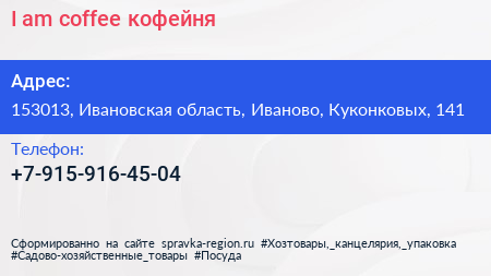 I am coffee, кофейня по адресу 153013, Ивановская область, Иваново, Куконковых, 141 в дальнейшем Организация, размещена в следующих категориях:
