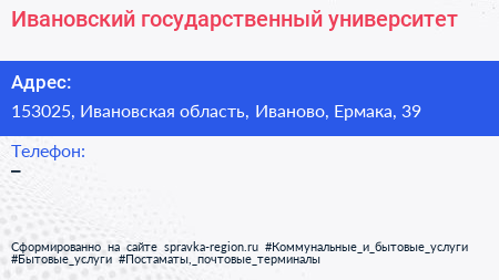Ивановский государственный университет по адресу 153025, Ивановская область, Иваново, Ермака, 39 в дальнейшем Организация, размещена в следующих категориях:
