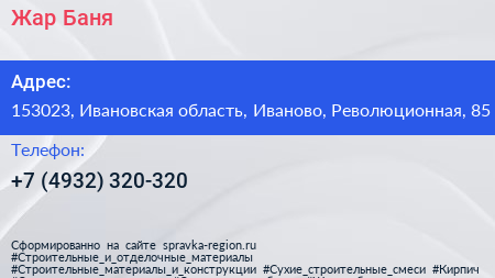 Жар-Баня по адресу 153023, Ивановская область, Иваново, Революционная, 85 в дальнейшем Организация, размещена в следующих категориях: