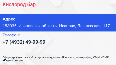 Кислород, бар по адресу 153035, Ивановская область, Иваново, Лежневская, 117 в дальнейшем Организация, размещена в следующих категориях: