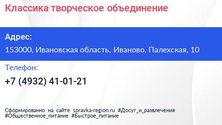 Классика, творческое объединение по адресу 153000, Ивановская область, Иваново, Палехская, 10 в дальнейшем Организация, размещена в следующих категориях: