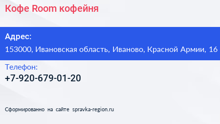 Кофе Room, кофейня по адресу 153000, Ивановская область, Иваново, Красной Армии, 16 в дальнейшем Организация, размещена в следующих категориях: