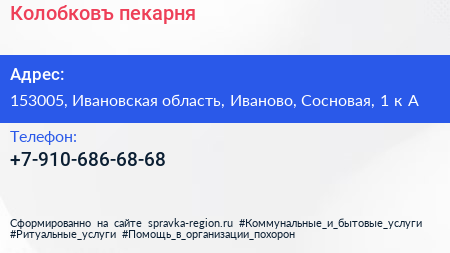Колобковъ, пекарня по адресу 153005, Ивановская область, Иваново, Сосновая, 1 к А в дальнейшем Организация, размещена в следующих категориях: