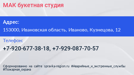 МАК, букетная студия по адресу 153000, Ивановская область, Иваново, Кузнецова, 12 в дальнейшем Организация, размещена в следующих категориях: