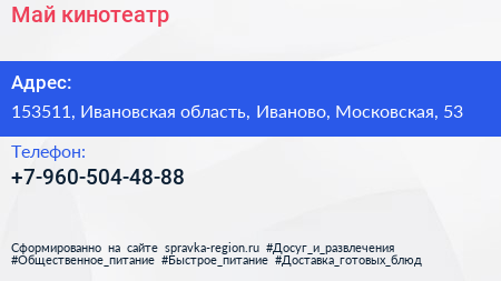 Май, кинотеатр по адресу 153511, Ивановская область, Иваново, Московская, 53 в дальнейшем Организация, размещена в следующих категориях: