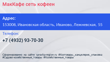 МакКафе, сеть кофеен по адресу 153008, Ивановская область, Иваново, Лежневская, 55 в дальнейшем Организация, размещена в следующих категориях:
