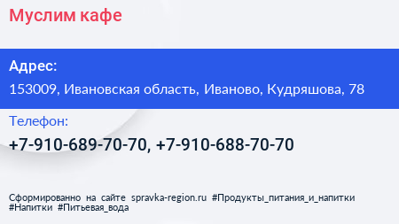Муслим, кафе по адресу 153009, Ивановская область, Иваново, Кудряшова, 78 в дальнейшем Организация, размещена в следующих категориях: