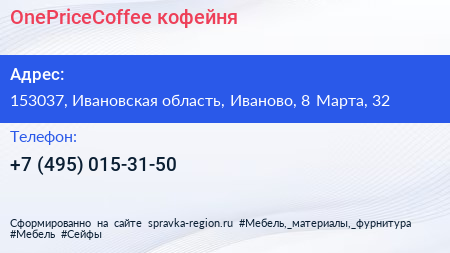 OnePriceCoffee, кофейня по адресу 153037, Ивановская область, Иваново, 8 Марта, 32 в дальнейшем Организация, размещена в следующих категориях:
