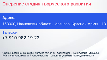 Оперение, студия творческого развития по адресу 153000, Ивановская область, Иваново, Красной Армии, 13 в дальнейшем Организация, размещена в следующих категориях: