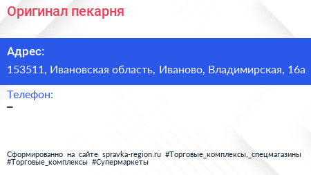 Оригинал, пекарня по адресу 153511, Ивановская область, Иваново, Владимирская, 16а в дальнейшем Организация, размещена в следующих категориях: