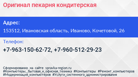 Оригинал, пекарня-кондитерская по адресу 153512, Ивановская область, Иваново, Кочетовой, 26 в дальнейшем Организация, размещена в следующих категориях: