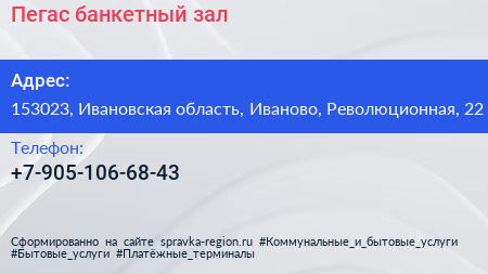 Пегас, банкетный зал по адресу 153023, Ивановская область, Иваново, Революционная, 22 в дальнейшем Организация, размещена в следующих категориях: