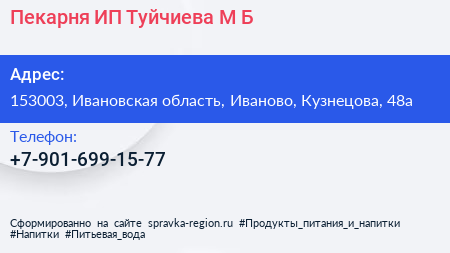 Пекарня, ИП Туйчиева М.Б. по адресу 153003, Ивановская область, Иваново, Кузнецова, 48а в дальнейшем Организация, размещена в следующих категориях: