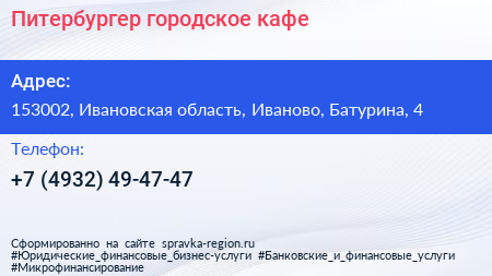 Питербургер, городское кафе по адресу 153002, Ивановская область, Иваново, Батурина, 4 в дальнейшем Организация, размещена в следующих категориях: