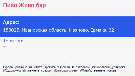 Пиво Живо, бар по адресу 153025, Ивановская область, Иваново, Ермака, 32 в дальнейшем Организация, размещена в следующих категориях: