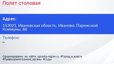 Полет, столовая по адресу 153021, Ивановская область, Иваново, Парижской Коммуны, 86 в дальнейшем Организация, размещена в следующих категориях: